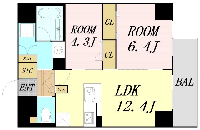 LDK 12.4帖/洋室 6.4帖/洋室 4.3帖 - 向き
